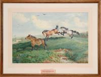 MAHER N. MORCOS (American, 1946-Present) CAPTURING THE RUNAWAY. Limited Edition 5/45. Cast bronze figural group depicting a Native American warrior on horseback chasing down a youth and on runaway horse, both horses in full gallop on a rocky plinth bearing the artist’s thumb print, copyrighted signature, and limited edition 5/45 on a rectangular marble plinth. SIZE: 17-3/4” h x 27-3/4” l. CONDITION: Very good overall, original patina. 9-74587 SM (1,500-2,500)