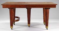 AMERICAN BRASS ADJUSTABLE GOOSENECK TABLE LAMP WITH EMERLITE CASED GLASS SHADE, FIRST QUARTER 20TH CENTURY. The sickle-shaped arm with adjustable light fixture mounted with a conical cased shade joined to the base pole with set-screw on a ribbed ring-turned base. PROVENANCE: Fine private Long Island, New York mansion. SIZE: 23-1/2” overall h, 6-3/4” dia. CONDITION: Base with old surfaces, shade appears old with minor flakes in top rim, otherwise all very good. 9-74188 SM (150-250)