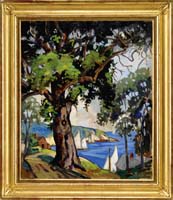 ANTHONY THIEME (American, 1888-1954) “BACK BEACH, ROCKPORT, MA”. Outstanding large oil on canvas Rockport, Massachusetts scene shows a dirt road winding along the northern section of Rockport Harbor alongside Back Beach with two figures under a tree, rocky shoreline with the town on a peninsula beyond. A sailboat exits the harbor area on a blue ocean. Along the dirt road are houses with a solitary figure in red. Scene is framed with large trees and light blue sky. One of the finest paintings by this artist that we have ever handled. Housed in a fine carved gilt custom frame with a Guido Frame Studio label. Several labels are attached to reverse including an exhibit label from the Lynn Museum & Historical Society. The back has title and artist number “1508”. SIZE: 30” x 36”. CONDITION: Very good. 9-90418 FP (60,000-75,000)