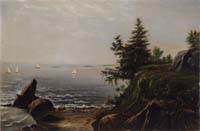 PETER LAUREN TYSVER (American, 20th Century) “EASTERN POINT LIGHT-. GLOUCESTER”. Fine oil on canvas Gloucester harbor scene shows a view of the breakwater and lighthouse at the entrance to Gloucester harbor. The sun shines brightly on calm water with a sailboat under light blue and cloud sky. Foreground with rocks, bushes and grass. Signed lower left. Signed, titled and dated “2004” on back. Housed in a modern carved and gilt wide frame. SIZE: 22” x 24”. CONDITION: Very good. 9-90231 MD (2,000-3,000)