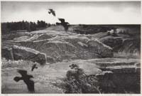ROSS SANTEE (American, 1889-1965) SLOW GOING. Limited edition etching shows a man on a burro on a small hill. Matted but unframed. SIGHT SIZE: 7-1/2” x 6-1/4”. CONDITION: Some light foxing, good. 9-90318 (100-200)