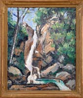 OTIS PIERCE COOK (American, 1900-1980) FALL RIVER POOL. Oil on canvas autumn scene shows a New England landscape with river having large pool and cascading water outflow surrounded by colorful trees. Signed lower right. Housed in its original light green decorated wood frame with white liner. SIZE: 20” x 24”. CONDITION: Very good. 9-73886 SM (1,000-1,500)