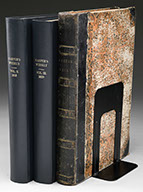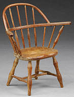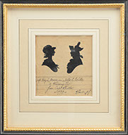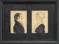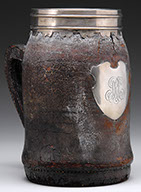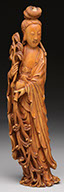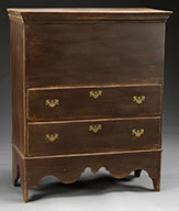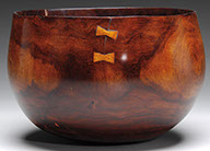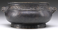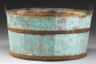 CHINESE EXPORT BOWL AND BAMBOO BRUSH POT. 19th century. Porcelain bowl decorated on interior with mountainous treed landscape. Exterior paint decorated with flowerheads on dark green ground. Base with artist seal mark. Brush pot decorated with gold lacquer symbols and leafy design centering panel of flying geese fitted with copper liner. SIZE: Bowl: 4-1/4″ h x 10-1/2″ dia. Brush pot: 6-1/2″ h x 8-1/4″ dia. PROVENANCE: From a fine southern Maine home. CONDITION: Bowl with extensive wear to interior decoration and with spider hairline in base. Brush pot with original surfaces and good patina. 9-25117 (200-400)
