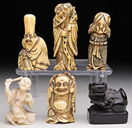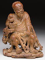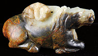 JADE CARVING. Late 19th, early 20th century, China. Figure of Shou Lao with a crane and a small boy. Celadon colored stone with russet areas. SIZE: 2-1/2″ h. CONDITION: Very good. 9-28004 (200-300)