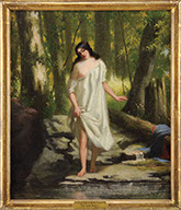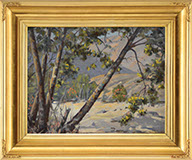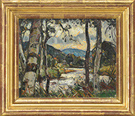 WILLIAM LESTER STEVENS (American, 1888-1969) LATE WINTER MELT. Oil on canvas Housed in a carved wood period frame by Carrig-Rohane shop in 1924 Signed “W. Lester Stevens 1934″, lower right SIZE: 35″ x 42”. Overall: 39-1/4″ x 46″ PROVENANCE: The John F. Gale Collection, Cambridge, MA CONDITION: Relined on new stretcher, retouch to bottom edge, appears to have a dirty varnish layer 9-27338 (8,000-12,000)