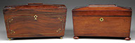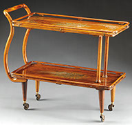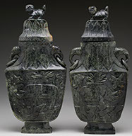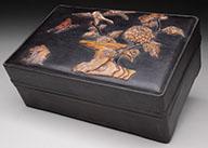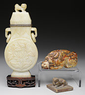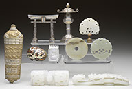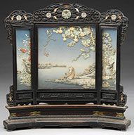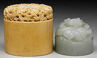 CIGARETTE BOX AND TRAY. Early 20th century, Japan. Top inset with a rondel of carved chrysanthemums. Together with a 19th century pure white jade plaque of rectangular form. SIZE: Box: 4″ x 3″. Plaque: 2-1/4″ x 1-3/4″. CONDITION: Good with minor loss to the stand. 9-28082 (200-300)