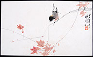 HANGING SCROLL. China, ink and color on paper, depicting bird amidst red leaves, signed “Baishi,” with two seals, provenance written to the margin of the mounting (given by Beijing No. 1. Factory to a Japanese company for its tenth year anniversary). SIZE: 27″ x 10-1/2″. CONDITION: Creases. 9-28061 (300-400)