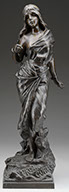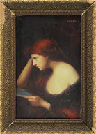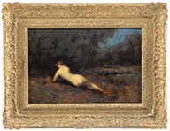 BRUCE CRANE (American, 1857-1937) “SPRING”. Oil on canvas Housed in a 1930’s carved & gold painted frame, cut down with losses Signed “Bruce Crane NA” lower left Identified & titled on the Greenwood Galleries, Stonington, CT label on verso SIZE: 18″ x 24″. Overall: 22″ x 28″ PROVENANCE: The John F. Gale Collection, Cambridge, MA; Sotheby’s, NY 3/8/07; The Greenwood Gallery, CT; Christie’s, NY 10/9/03 CONDITION: Heavy impasto, scattered craquelure, retouch primarily to center of composition 9-27392 (4,000-6,000)