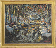 WILLIAM LESTER STEVENS (American, 1888-1969) “FALLS OF SHELBOURNE (ICY BROOK)”. Oil on canvas Housed in a gold a Guido frame, in good condition Signed “W. Lester Stevens NA”, lower right Identified on Child’s Gallery, Boston, label and on canvas and stretcher. Rockport Art Association Exhibition label affixed to frame verso Exhibition History: Rockport Art Association, W. Lester Stevens, N.A. Retrospective, September 27- November 9, 2003 illustrated on page 25 in Stevens’ book written by Judith A. Curtis. SIZE: 30″ x 36″. Overall: 36″ x 42″ PROVENANCE: The John F. Gale Collection, Cambridge, MA CONDITION: Very good 9-27283 (6,500-8,500)