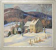 ALDRO THOMPSON HIBBARD (American, 1886-1972) VERMONT WINTER HOMESTEAD WITH SLEIGH. Oil on artist’s board Housed in a gold Guido frame in good condition Signed “A.T. Hibbard”, lower right SIZE: 9″ x 12″. Overall: 11″ x 14″ PROVENANCE: The John F. Gale Collection, Cambridge, MA CONDITION: Very good 9-27295 (3,000-4,000)