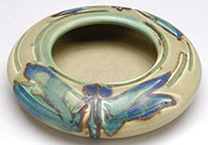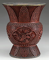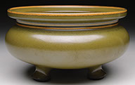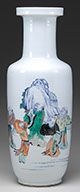 MINIATURE BRUSH POT. Late 19th, early 20th century, China. Decoration of bats and peaches and stylized flowers on a lime green ground. 6-character mark on base. SIZE: 2-1/2″ h x 2-1/4″ dia. CONDITION: Minor rubbing to gilt. 9-27614 (300-500)