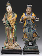 TWO PAINTED LEAVES. China, ink and light color on paper. Depicting a scholar traveling in a mountainous landscape, accompanied by his attendant carrying a zither, inscribed, signed “Fu Bashi,” with two seals. 2) Depicting two recluses in a mountainous landscape with trees, inscribed, signed “Fu Baoshi,” dated the eighth month of 1960, with three seals. SIZE: 9-1/2″ x 13-1/4″ each. CONDITION: Good. 9-27642 (400-600)