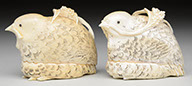 TWO ENAMELED SNUFF BOTTLES. China. One double gourd shaped, finely painted with a design of melons and foliage with butterflies. The other with magpies in a flowering tree. Each fitted with coral stopper. Both with Ch’ien Lung marks in blue. SIZE: 1) 2-1/4″ h. 2) 2″ h. CONDITION: Very good. 7-73298 (300-500)