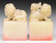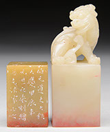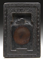INKSTONE. 19th century, China. Surface carved with thunder meander patterns, brocade patterns and a mouse. Inscription on reverse. SIZE: 5-1/4″ x 3-3/4″. CONDITION: Old surfaces remain intact and untouched. Generally very good. 7-73385 (100-150)