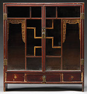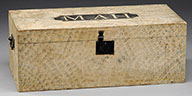 MAH JONGG SET. Early 20th century, China. The red lacquered case with gilt decoration of panels depicting people gaming. The front, a sliding lid opening to an interior fitted with a bank of five drawers, each with ivory and wood Mah Jongg game pieces. Accompanied by instruction booklet. SIZE: 7″ h x 8″ w x 6″ d. CONDITION: Very good. 9-27470 (50-75)