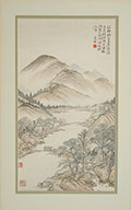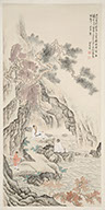 HANGING SCROLL. China, ink and color on paper, depicting recluses in a cottage amidst a verdant landscape, dedicated to the occasion Mr. Juqing successfully acquiring a land, inscribed, signed “Binhong at age of eighty-six,” dated yichou year, with two seals. SIZE: 29-1/2″ x 11-1/4″. CONDITION: Good with minor foxing. 7-73484 (300-400)