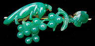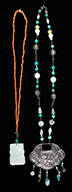 WHITE JADE PLAQUE. 20th century, China. Surface carved in relief with Immortals carved on one side and fruiting trees on the other. SIZE: 2″ w x 1-1/2″ h. CONDITION: Very good. 7-72766 (300-500)