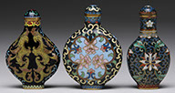 GROUP OF THREE CLOISONNE SNUFF BOTTLES. China. Two with floral decoration, the third decorated with archaic dragons. Each with Ch’ien Lung mark. SIZE: Each: 2-3/4″ h. CONDITION: Very good. 7-73174 (300-500)