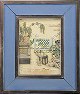 PORCELAIN PLAQUE. Republican Period, China. Scene of two scholars playing chess mounted in a rosewood frame. SIZE: 12″ h x 7-1/2″ w. CONDITION: Very good. 7-73251 (200-300)