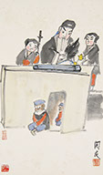 HANGING SCROLL. China, ink and color on paper, abstract landscape of boats, cottages with a mountainous backdrop, signed “Wu Guanzhong,” with one seal “Tu,”. SIZE: 27″ x 17-1/2″. CONDITION: Good. 9-28058 (300-500)