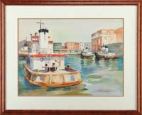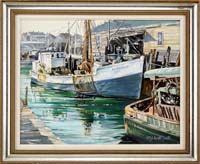 HENRY BILLINGS (American, 1894-)GLOUCESTER TROLLERS. Oil on canvas scene shows a blue fishing troller moored next to a black fishing troller in between two docks. An overhead sun sheds light on the boats and harbor water. Signed lower left “Billings”. Housed in its original carved wood frame. SIZE: 20″ x 24″. CONDITION: Very good. 9-91584 (2,500-4,000)