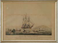 CLEMENT DREW (American, 1806-1889. “THATCHER’S ISLAND LIGHT, CAPE ANN”. Oil on academy board seascape shows two sailboats in rough seas going by the twin lighthouses of Thatcher’s Island off Rockport, Mass. Titled and signed on reverse and dated “1884”. Housed in a fine gilt molded wood frame. SIZE: 9-1/4” x 12”. PROVENANCE: Rankin Estate, Annapolis, Maryland. CONDITION: Very good 9-29659 (1,000-1,500)