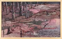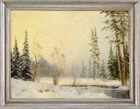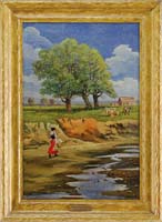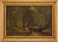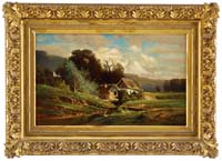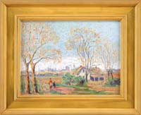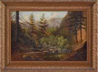 WAYNE BEAM MORRELL (American, 1923-) LATE FALL LANDSCAPE. Unsigned oil on masonite late fall scene shows a man standing by an overflowing stream with a barn and outbuildings beyond. Housed in a gilt carved wood modern frame. SIZE: 17-1/2″ x 23-1/4″. CONDITION: Very good. 9-91097 (800-1,200)