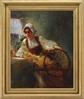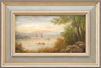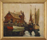 EMILE ALBERT GRUPPE (American, 1896-1978) “MORNING CHORES”. Oil on artist board scene shows three men working on a large net which is being taken off a fishing boat. The men work on a large dock which the boat is moored to. Two other figures are seen on opposite dock, one in a small boat and other boats and buildings are seen in the harbor. The scene has the glow of morning sun and lifting fog. Signed lower right. Housed in a modern silver gilt wood frame. SIZE: 16″ x 20″. CONDITION: Very good. 9-91226 (8,000-12,000)
