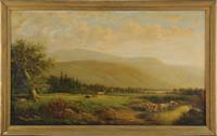 THOMAS M NICHOLAS (American, 1963-) THE RED BARN. Fine oil on masonite summer scene shows a large Colonial red house having a two-story red barn on stone foundation. Fields lined with rock walls spotted with trees. Signed lower right “TM Nicholas”. Housed in a fine carved and gilt modern wood frame. SIZE: 12″ x 20″. CONDITION: Very good to excellent. 9-91597 (2,500-3,500)