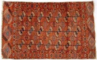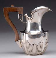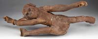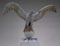 ORIENTAL CARVED JADE STYLIZED PERCHING EAGLE TOGETHER WITH A CLAY FIGURE OF SEATED DEITY & SOUTH AMERICAN REDWARE DOG FORM PITCHER. Clay figure being Central or South American. The dog pitcher, possibly Columbian, having flattened round body raised on three stylized feet, the handle in the form of a dog’s head with pointed ears, the flaring spout, the animals tail. SIZE: 1) 3-1/4” h eagle. 2) Figure is 3-1/4”. 3) Dog pitcher 4-1/4”h x 10-1/4”l x 6-1/4”w. PROVENANCE: Fine private Long Island, New York mansion. CONDITION: Shell fractures and concussion marks on back of eagle. Eagle detached from plinth. Clay figure and dog pitcher very good. 9-739699-73963 (300-500)