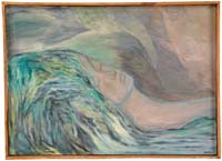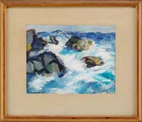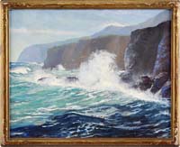 JAY HALL CONNAWAY (American, 1893-1970) MAINE COAST. Oil on board shows green and white waves crashing on grass covered rocky ledge. Storm clouds in background. Signed lower right “Connaway” and dated “10.6.42”. Housed in a partial gilt molded wood frame. SIZE: 16″ x 20″. CONDITION: Very good. 9-91274 (1,500-2,500)