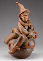 GUSTEL MORTON (AMERICAN, 1902-?) TERRACOTTA FIGURE OF A CLOWN WRESTLING A SEAL. Depicting a smiling clown with peaked hat wrestling a seal while perched on a ball. The surface in a mottled finish. Signed indistinctly around bottom rim in faded black paint. SIZE: 21-1/2″. CONDITION: Good original surfaces and color. Old chip on clowns pant cuff. 9-74604 (500-750)