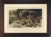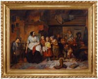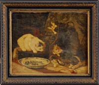 CONTINENTAL FRAMED “BAS-RELIEF” OF AN INTERIOR SCENE. Late 19th century. Cast in lead with a copper wash, depicting a musician in period dress seated on a bench playing to two women in a kitchen interior. Mounted within a scrolled gilt frame. SIZE: 8″ x 6″. CONDITION: Very nice, with minor gilding loss to frame. 9-91570 (50-100)