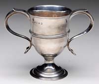 COVERED FOOTED SHEFFIELD SILVER TUREEN. Double handled tureen having a large stepped round foot which is unmarked leading to a tapered rounded lobe decorated body with a gadroon type edge. Fitted cover has a rim slot for ladle and a nice fruit knop. Armorial crest on side. 19th Century. SIZE: 12″ h x 10″ dia without handles CONDITION: Very good. 9-91522 (50-100)