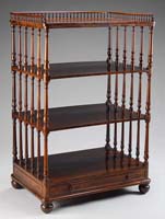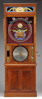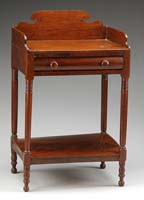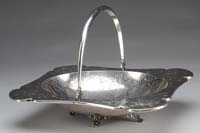 EDWARDIAN METAL-MOUNTED OAK THREE-DECANTER TANTALUS. Circa 1890. Of open form, the swiveling and locking silvered top with handle fitted to the open case with scrolling ends. Contains three square cut-glass stoppered decanters mounted on the oak plinth base, stamped on the silvered handle “BETJEMANN’S PATENT 26658 LONDON”. The opposing end stamped “THE TANTALUS”. SIZE: 12-1/2″ h. x 16-1/4″ l. x 6″ w. CONDITION: Retains original finish with good patina, handle with expected wear to silver plate exposing copper base. Decanters with minor flakes. Decanters and stoppers all original, locked and missing key. 9-90985 (350-450)