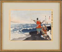 SAMUEL PETER ROLT TRISCOTT (American, 1846-1925)OLD FOG STATION ON MANANA ISLAND. Fine watercolor scene shows crashing waves on a rocky shore with sails on the horizon and the old fog station on a rocky bluff. Signed lower left “SP Rolt Triscott”. Beautifully housed in a blue and gold wood frame with thick linen matte. In 1905 Triscott moved to Monhegan and lived there permanently until the end of his life. He was one of the first artists to make the island his home. SIZE: SIGHT: 9″ x 13″. CONDITION: Very good. 9-91300 (1,500-2,500)