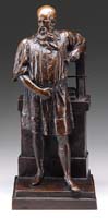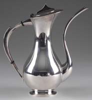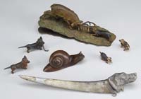 INTERESTING LOT OF METAL ITEMS. Lot includes: Two 3″ h silver figural bells, probably of South American origin, each of a woman; 3″ h metal teapot with dog cover, Oriental design; 4-3/4″ dia. bronze disc with stork, turtle and trees. The turtles shell has a hole to allow for hanging; 1-1/2″ handled silver cup engraved with flowers in panels and bird; 8″ museum replica metal figure (loss to leg); 2-3/4″ bronze Columbian style figure; Two small brass figures CONDITION: As noted above, otherwise good. 9-741959-74431 (100-200)