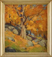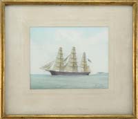 EMILE ALBERT GRUPPE (American, 1896-1978) HENRY FORD SCHOONER. Outstanding oil on canvas portrait of the schooner Henry Ford. It is shown sailing from left to right slightly toward viewer. A crew member is atop one of the masts and the schooner is leaning over in brisk wind. Light blue and cloud sky and deep blue ocean. The Henry Ford was built by A. D. Story and its home port was Gloucester, Massachusetts. The boat plans were drawn in 1921 and donated to the Mystic Seaport Museum. It won the 1922 International Cup Elimination trial but lost to Bluenose in 1922. It went on to win the 1923 Fisherman’s Race on Gloucester’s 300th Anniversary. The racing fisherman, as this boat is known as, was designed primarily to meet the requirements of International racing and have been held up as the finest examples of the Gloucester fishing schooners that were ever built. Signed lower right. Housed in its original carved and wood gilt frame. Titled on top of back stretcher. A nice early work. SIZE: 30″ x 25″. CONDITION: Very good. 9-91562 (12,000-16,000)