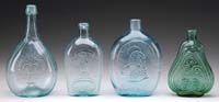 LOT OF SEVEN GLASS PIECES. Lot includes: Two 9-1/2″ h overlay blue to clear decanters with original heavy stoppers having silver rims marked “Sterling”; 9-1/2″ square clear decanter with polished pontil marked “Baccarat France” and having a sterling liquor tag “Jerez”; 9-1/2″ clear glass decanter marked “St. Louis” with sterling liquor tag “Cognac” – interior cloudy; Pair of 8-1/2″ h enamel decorated dresser bottles in lime green color; 10-1/2″ enamel decorated Victorian vase with ruffled rim. CONDITION: As noted above, very good. 9-91161 (500-800)