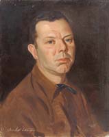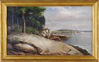 EMILE ALBERT GRUPPE (American, 1896-1978) “THE CLAMER”. Oil on canvas scene shows two men and a small motorboat landing on a small beach area. They are at the end of a cove lined with rocks and trees. Signed lower left. Housed in a fine gilt molded wood replacement frame. Title and artist on back of stretcher “The Clamer by Emile A. Gruppe Long Island, NY”. SIZE: 25″ x 30″. CONDITION: Very good. 9-91265 (12,000-16,000)