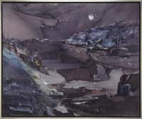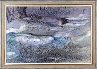 LAURENCE PHILIP SISSON (American, 1928-)”TIDAL VESTIGE”. Outstanding oil on board Maine shoreline scene shows tidal pools reflecting the detailed pebble, rock and brush lined beach. The colors in shades of purple, blue, gray and green. Signed lower left “L. Sisson”, titled on reverse. Housed in what appears to be its original weather decorated molded wood frame with gilt and linen liner. An outstanding example of this subject matter by this Maine artist. SIZE: 30″ x 44″. PROVENANCE: Lad Heldenbrand Estate, So. Portland, Maine. CONDITION: Very good. 9-90925 (2,000-3,000)