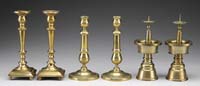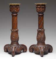PAIR OF LARGE CARVED OAK PILLAR CANDLE HOLDERS IN THE BAROQUE TASTE. Circa 1880. Each of columnar form, foliate carved with spiral twist standard raised on a scrolled tripod base. Fitted with bronze bobeches. SIZE: Each 17-1/2″ h. CONDITION: Very fine original overall condition. 9-90992 (200-400)