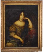 A PAIR OF MINIATURE HALF-PORTRAITS OF FEMALES, TOGETHER WITH A CONTINENTAL BRASS-, BONE- AND PAINT-DECORATED TRINKET BOX. Early 20th century. Each portrait an oil painting on copper depicting a woman in period dress, mounted in carved and gesso period frames. The trinket box with hinged lid of bone veneers centering an oval painting of court scene within beaded edge, the box with concave edges raised on scalloped feet. SIZE: Paintings: Each 4-1/4″ x 3″. Box: 2″ h. x 7-3/4″ l. x 5-1/2″ d. CONDITION: Paintings: very good, with minor damage to one frame. Box: no visible issues and no restoration. 9-91169 (200-300)