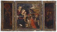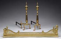 RENAISSANCE REVIVAL CAST-BRASS THREE LIGHT MIRRORED SCONCE TOGETHER WITH A FRENCH EMPIRE FOLDING SHAVING MIRROR. 19th century. Sconce headed by a cast bust of a Saytr above the beveled rectangular mirror plate within the cast pierced surround of dragons and leaf tips, fitted with C-scrolled candlearms fitted with bobeches. The brass three-fold mirror, each section bound in tooled brown leather, gilt-decorated with ribbon-tied wreaths interspersed with robed figures and a royal crowned displayed eagle, each panel hinged on a cylindrical turned foot. SIZE: The first 19 1/2″ , width 10 1/2″. Mirror with a height of 13 1/2 “. Overall length 31”. CONDITION: Both in very good original condition, the sconce with old polish. Nozzle in need of retapping. 9-91179 (250-400)