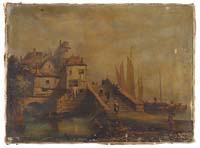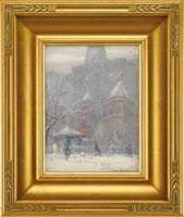 BERTHA E. BAXTER (American, 1895) FROZEN HARBOR, ROCKPORT. Oil on canvas harbor scene shows a two-mast schooner moored alongside a wharf with tall posts with different colored houses. Signed lower left and dated 1935. The harbor has ice and the snow covers the rooftops and boats. Housed in a fine gilt molded wood frame with bead edge. SIZE: 20″ x 24″. CONDITION: Minor inpainting, small v-shape repaired tear in green boat. Otherwise good. 9-91610 (1,200-1,800)