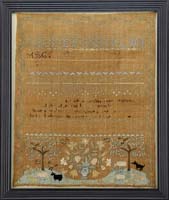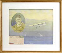 PAINTED CANVAS WATER BOTTLE COVER. The framed piece in the shape of a mug with a jolly man’s face surrounded by different male vices including cards, dice etc. The bottom margin with “My Wife Won’t Let Me”. The piece has been framed in a Victorian walnut frame with gilt liner. SIZE: 17-3/4″ x 11-1/2″ (Size of actual cover). CONDITION: Very Good. 9-90703 (400-600)