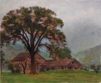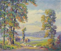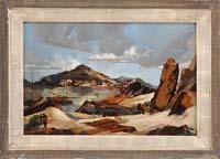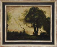JAY HALL CONNAWAY (American, 1893-1970) “OMINOUS SUMMER DAY”. Oil on canvas board shows a dark cloud approaching over a hillside with trees and field in foreground. One feels the impending storm. Unsigned front, but signed and titled on reverse by the artist. Housed in a good gilt decorative frame with gilt liner. SIZE: 18″ x 24″. CONDITION: Very good. 9-91219 (1,500-2,500)