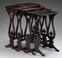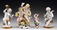 FOUR PORCELAIN FIGURINES. All Continental having putti forms. 1) 9″ h figurine having two putti, one with wings holding bird and nest with eggs, the other holding a gourd and apple. 2 & 3) Two 8″ musical theme putti’s in white with gold trim, one blowing horn and one playing the drums. 4) 5″ figurine of putti sitting on a stump eating grapes. CONDITION: Very good. 9-91159 (500-800)