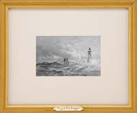 WILLIAM TROST RICHARDS (American, 1833-1905) “SHIP NEAR LIGHTHOUSE”. Gouache on paper scene shows a ship next to lighthouse with large waves crashing at side. White, gray and black image. Unsigned but bearing the label of William Vareika Fine Arts with artist, title and provenance “Family of the Artist”. Housed in a modern gilt molded wood frame with beige matte and having name plaque. SIZE: 4” x 6-1/2”. CONDITION: Very good. 9-91098 (1,000-1,500)