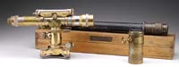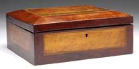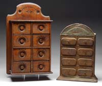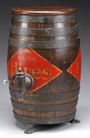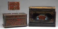 AN EDWARDIAN STAMPED BRASS AND OAK STATIONERY BOX TOGETHER WITH A PAINT-DECORATED GLASS CORDIAL SET. Circa 1900. The cask-form letter box with hinged lid opening to compartments decorated overall with floral vinery on a molded oak plinth. The glass cordial set of egg form with hinged lid opening to a conforming tray fitted with six cordials and a glass decanter, the interior of case reverse painted in fiery orange, the exterior painted with floral sprays applied with glass beading. SIZE: First: 6″ x 9-1/2″ x 4-1/2″. Second: 8-1/2″ h. CONDITION: The box in fine overall condition with original surfaces. The cordial set with losses to exterior paint decoration, some losses to interior paint, brass lid rim needs re-attaching, small chip to neck of decanter, otherwise good condition. 9-90994 (100-200)